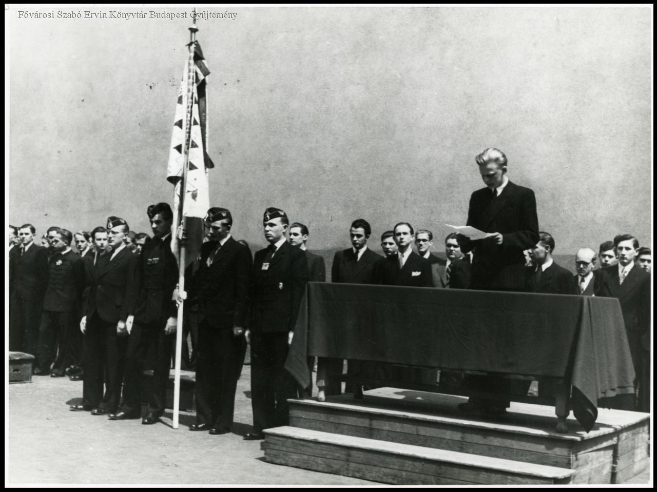 Diákok ünneplőben (Bocskaiban, egyensapkában), egy fiatalember ünnepi beszédet tart.