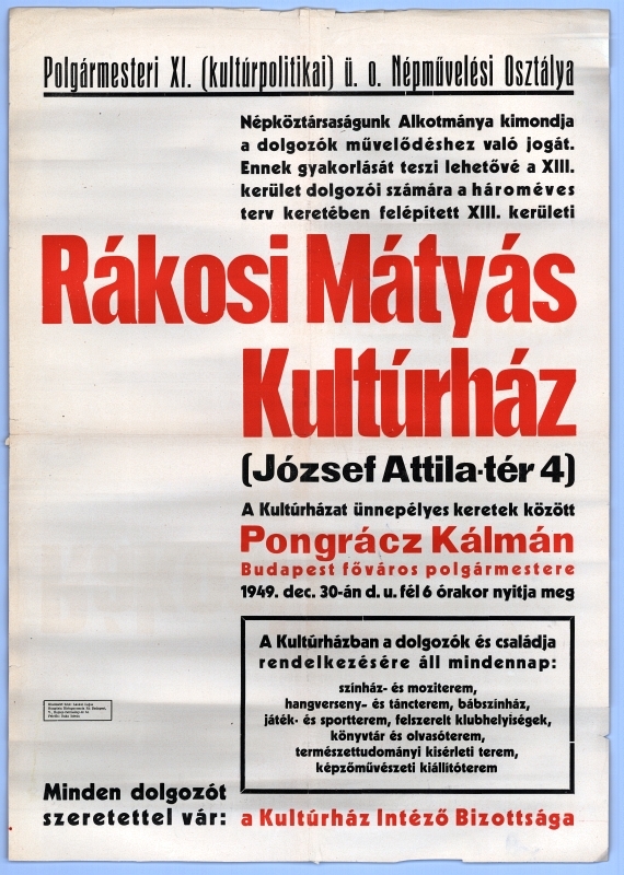 Nyomtatott plakát a XIII. kerületi Rákosi Mátyás Kultúrház megnyitásáról. A plakáton látható, hogy a kultúrházat 1949. december 30-án Pongrácz Kálmán, Budapest főváros polgármestere nyitja meg. Felsorolja a kultúrházban elérhető szolgáltatásokat (színház, mozi, klubok, könyvtár, kiállítások stb.). A plakátot a Kultúrház Intéző Bizottsága adta ki. Ma József Attila Művelődési Központ.