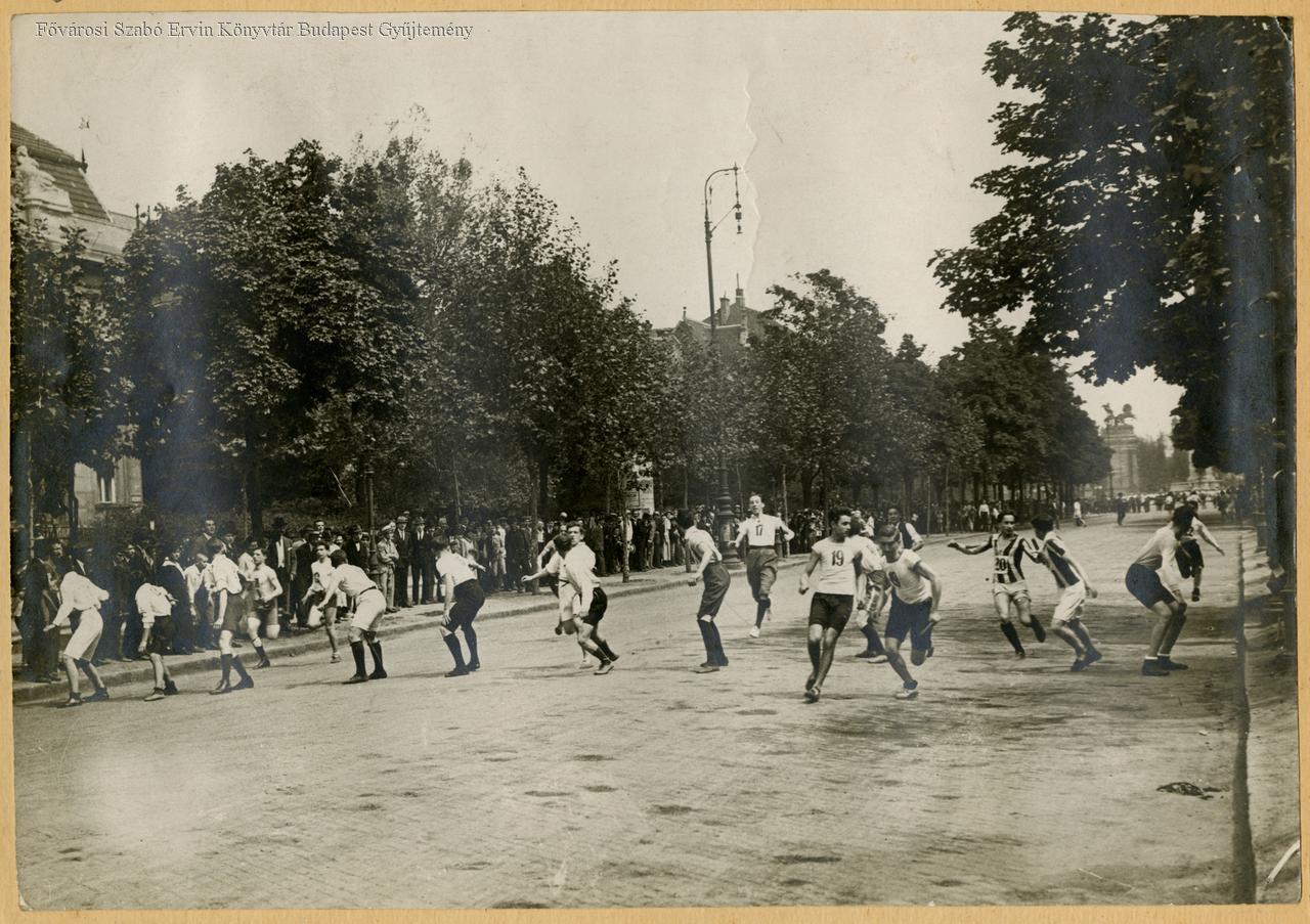 sajtófotó, sportesemény, futás, váltóverseny, férfi, ifjúság, sportruházat, fasor, közönség, 1920-as évek
