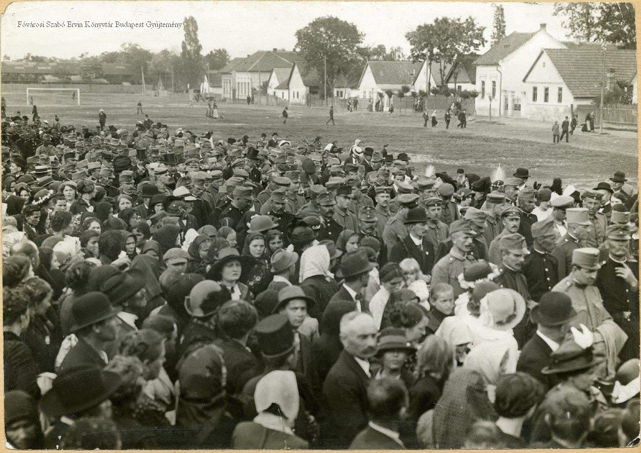 sajtófotó, eseménykép, első világháború, gyászszertartás, temetkezés, felvonulás, néptömeg, katona, németek, labdarúgópálya, baleset, 1915